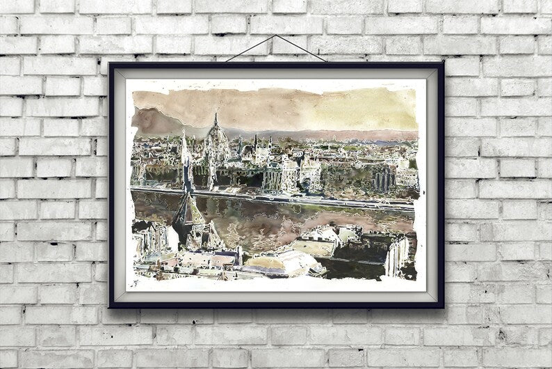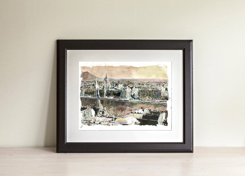 Horizonte de Budapest- Hungría. Parlamento húngaro y horizonte de Budapest obra de arte acuarela Hungría (impresión)