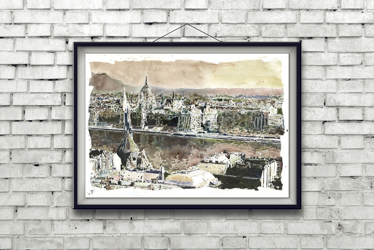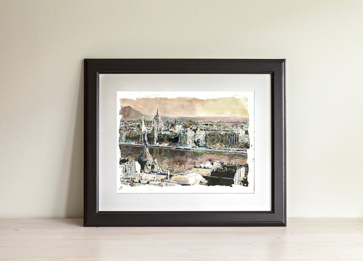 Horizonte de Budapest- Hungría. Parlamento húngaro y horizonte de Budapest obra de arte acuarela Hungría (original)