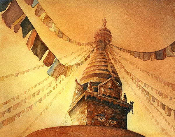 Pintura acuarela de los ojos de Buda pintada en la estupa de Swayambhunath al atardecer en el valle de Katmandú, Nepal. Arte budista. Pintura nepalí. Pintura de acuarela. Arte de la acuarela
