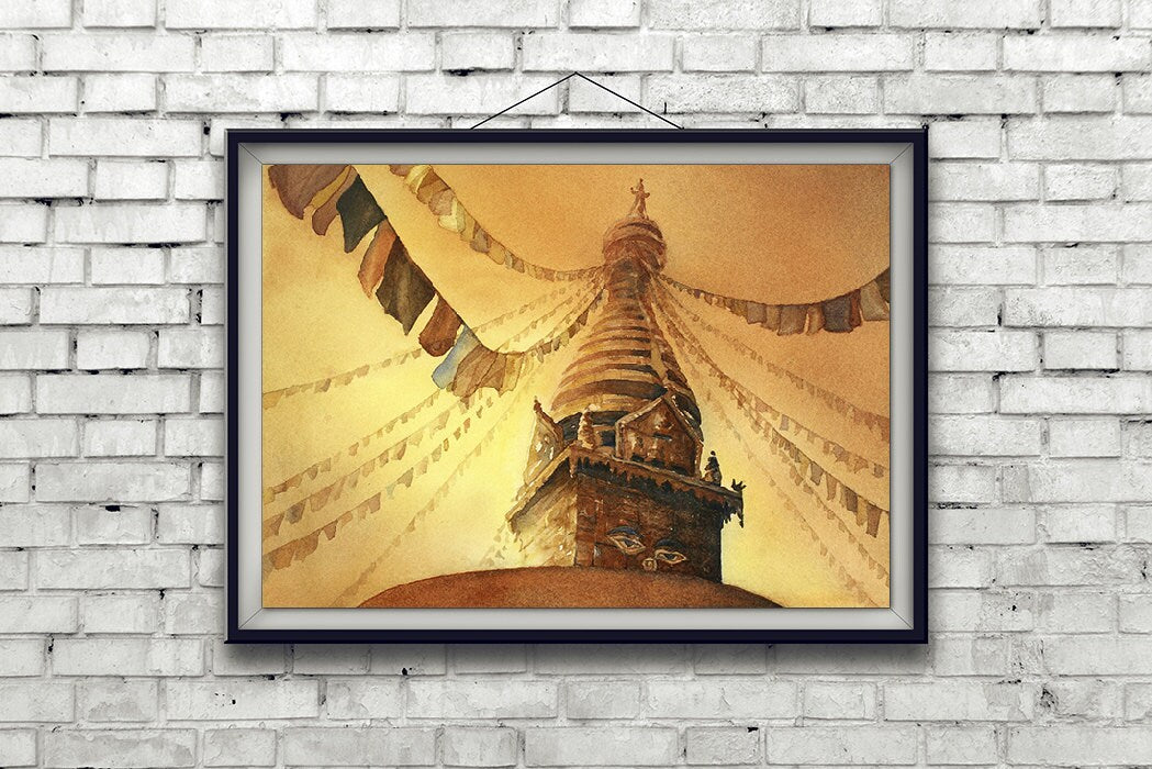 Ojos de Buda pintados en Swayambhunath Stupa en el valle de Katmandú, Nepal. Pintura nepalí. Arte nepalí. Decoración de pared de arte budista (impresión)