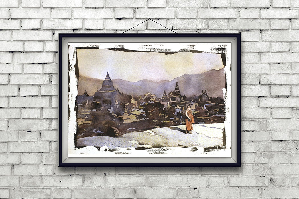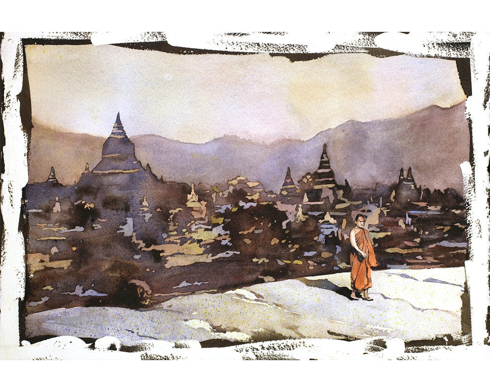 Monje budista con templo en ruinas de Bagan en la distancia-Myanmar (Birmania). Arte budista. Acuarela de templos paganos en ruinas (impresión)