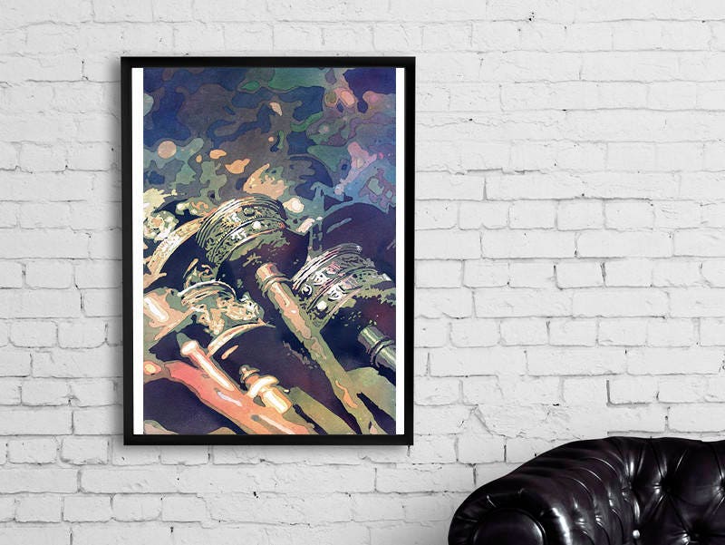 Ruedas de oración budistas sobre la mesa en el mercado de Katmandú, Nepal, Ruedas de oración pintura artística Nepal Budismo arte acuarela (impresión)