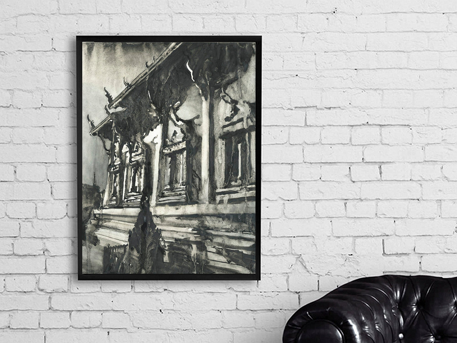 Templo budista de Wat Pra Singh en la ciudad de Chiang Mai, Tailandia. Budista wat Tailandia obra de arte monocromática Budismo acuarela (impresión)