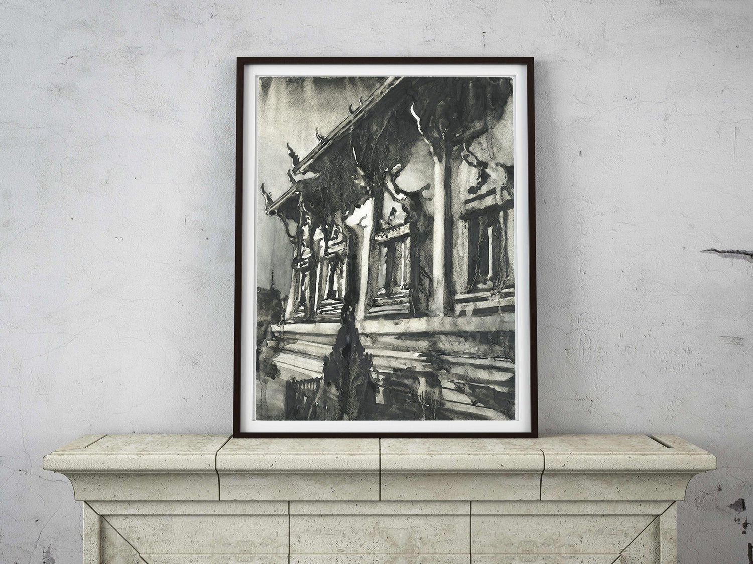 Templo budista de Wat Pra Singh en la ciudad de Chiang Mai, Tailandia. Budista wat Tailandia budismo monocromático acuarela (original)
