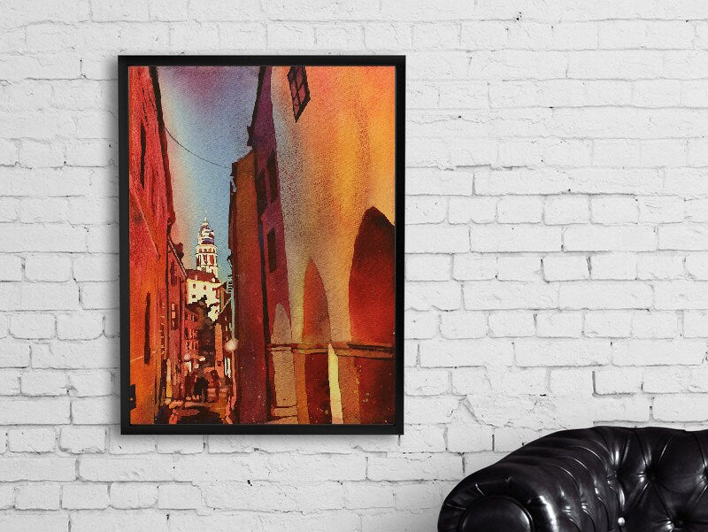 Pintura acuarela de bellas artes de la torre de la iglesia que se eleva sobre los edificios medievales de la ciudad de Cesky Krumlov, declarada Patrimonio de la Humanidad por la UNESCO, República Checa. Pintura de acuarela original. Decoración del hogar. Castillo República Checa. Castillo europeo.