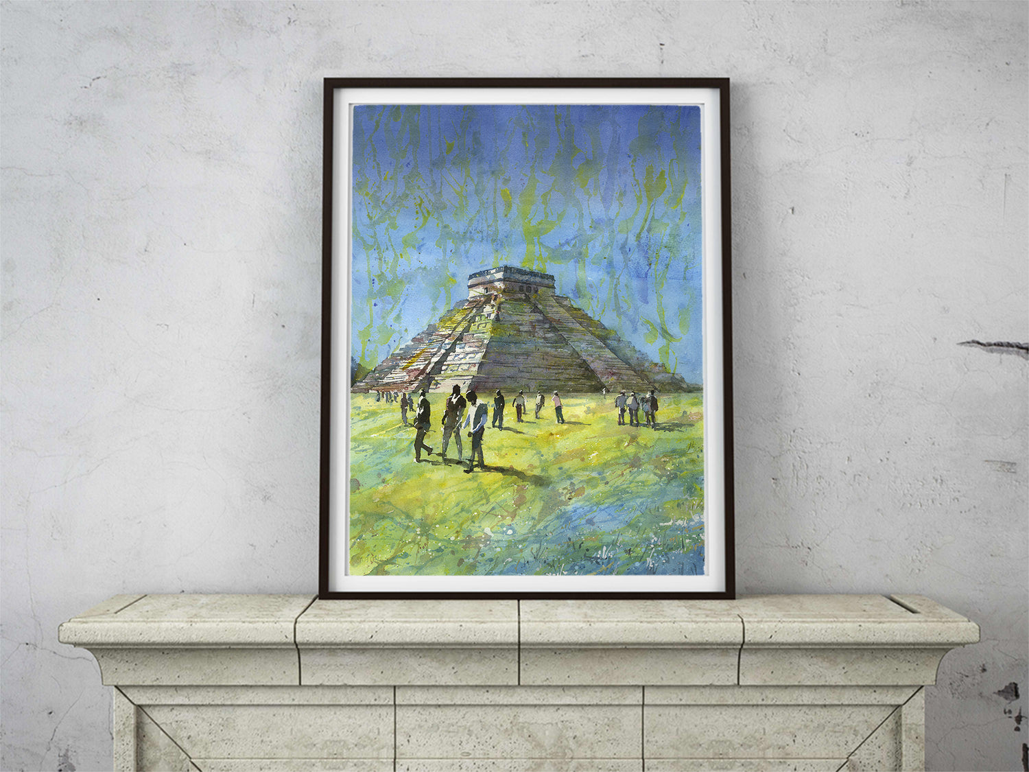 Colorida acuarela pintura de paisaje de Chichén Itzá, arte de pared de moda diseño de interiores artículo hecho a mano elementos esenciales de viaje giclee (impresión)