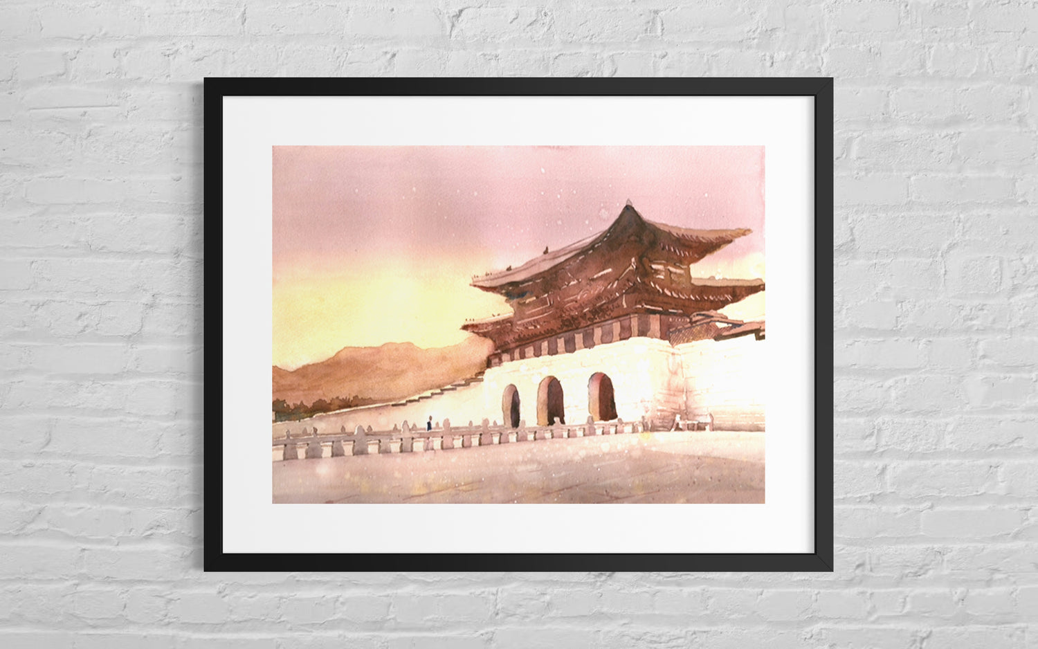 • Korean palace gate watercolor artwork – Gyeongbokgung at dusk in Seoul for interior designers and Korea travel blogs
