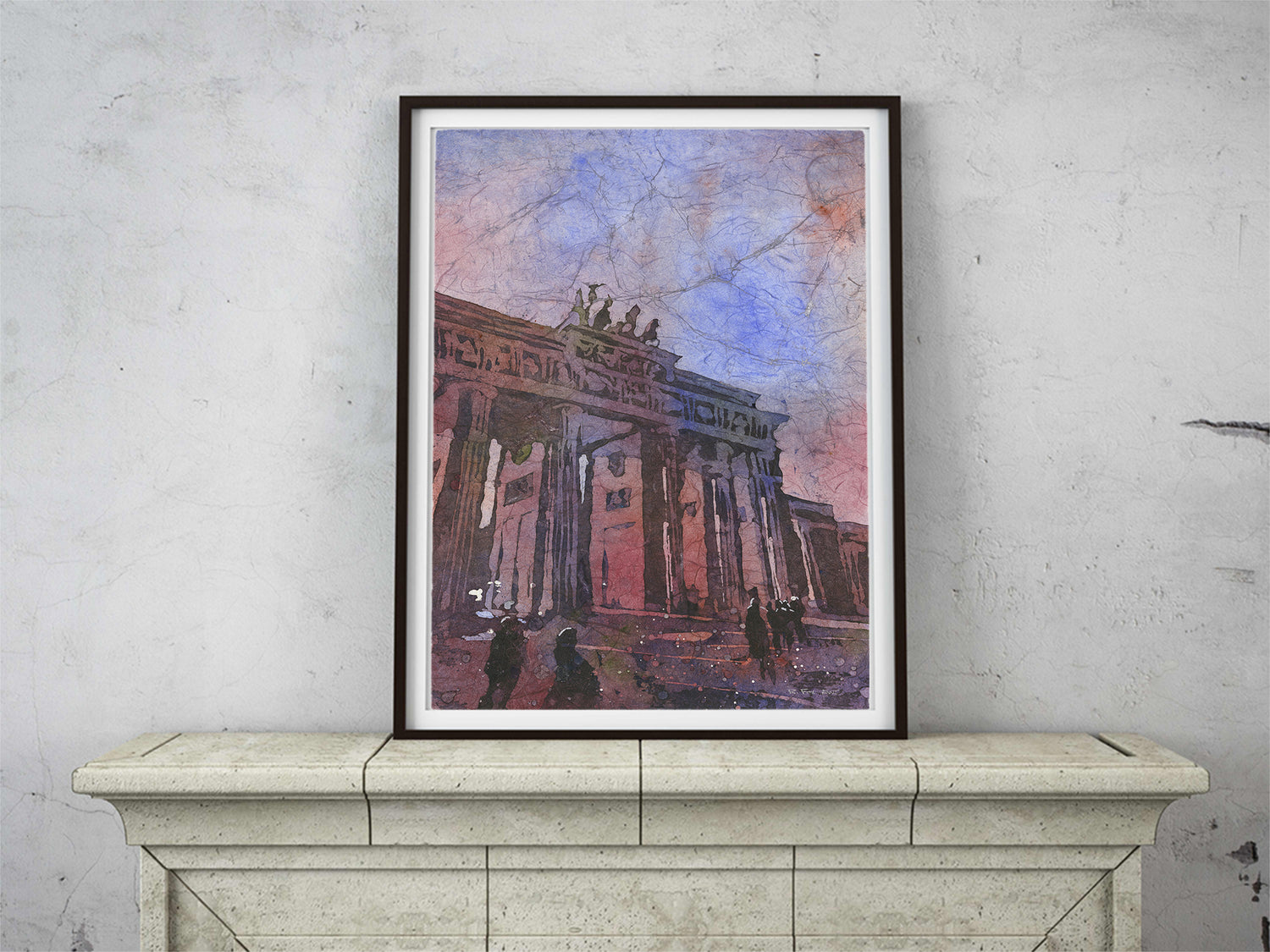 Watercolor painting of silhouette of Brandenburg Gate at sunset in the European city of Berlin- Germany. Landscape painting Berlin art home decor colorful.