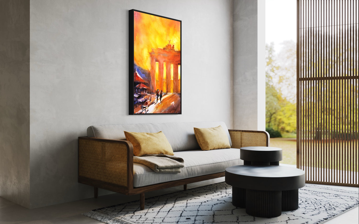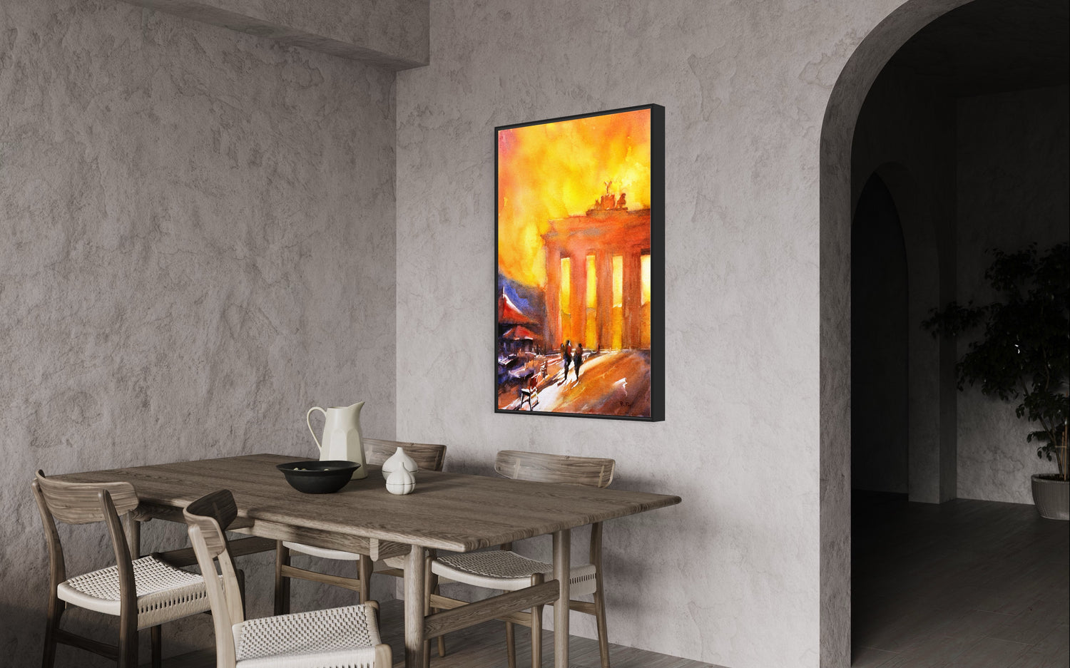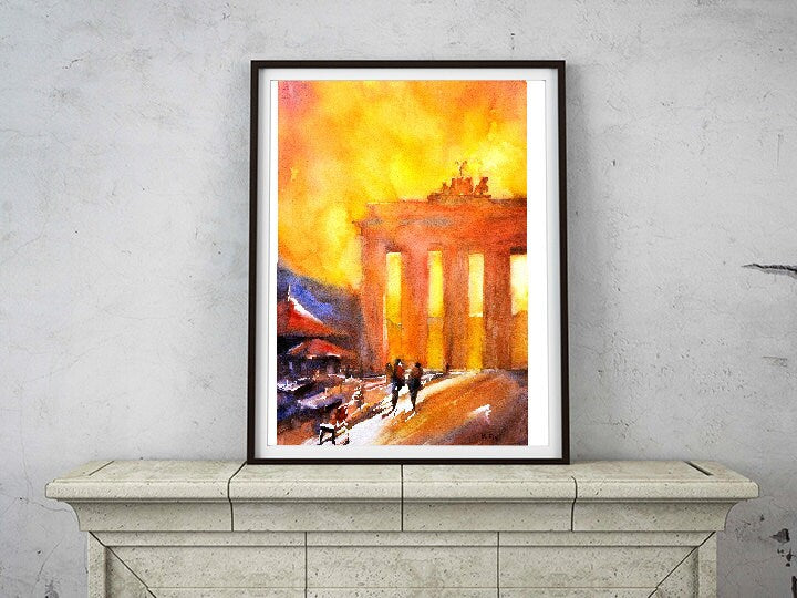 Watercolor painting of silhouette of Brandenburg Gate at sunset in the European city of Berlin- Germany. Landscape painting Berlin art home decor colorful.