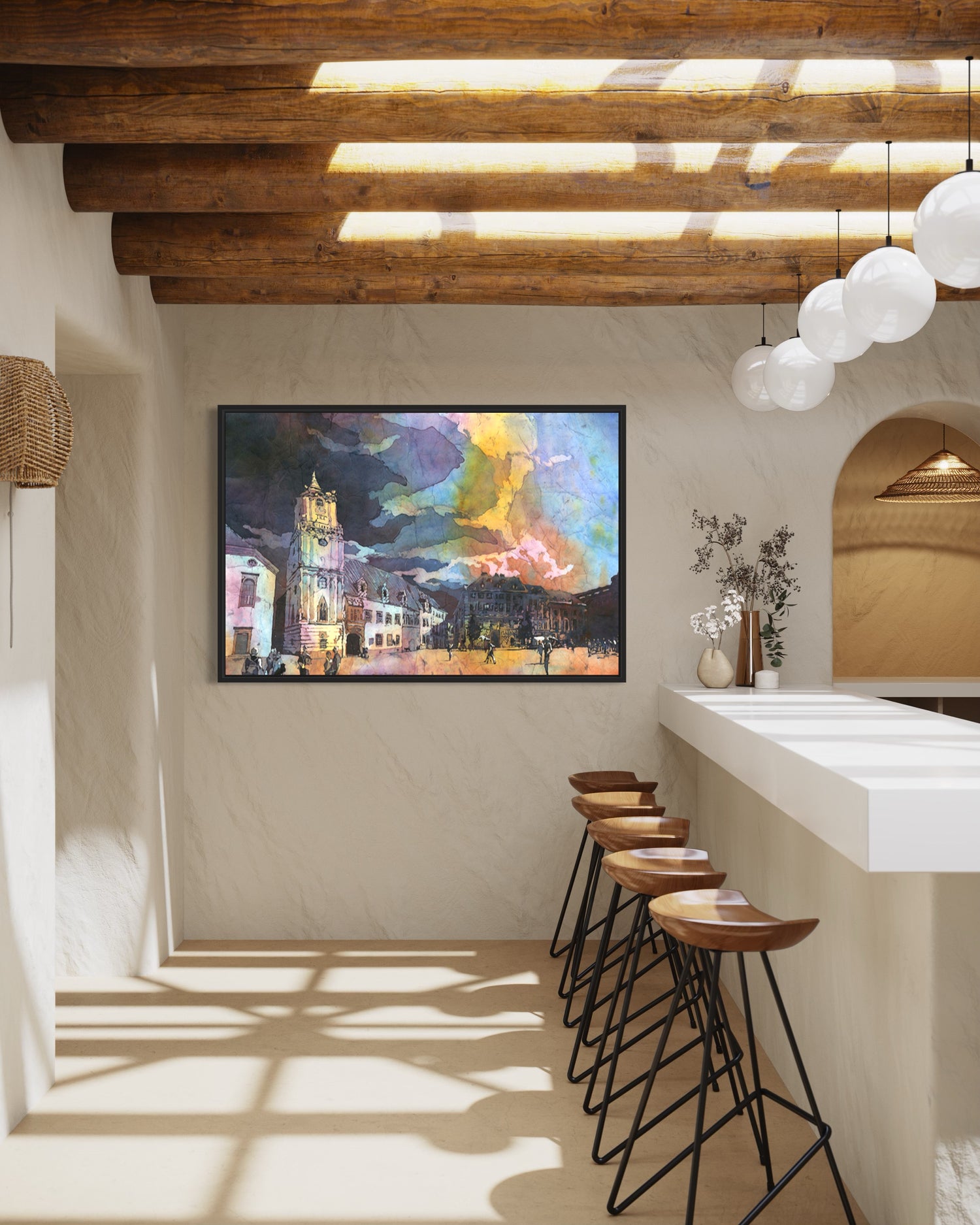 Bratislava Slovakia Old Town Hall at sunset colorful watercolor batik painting art for house interior design (print)