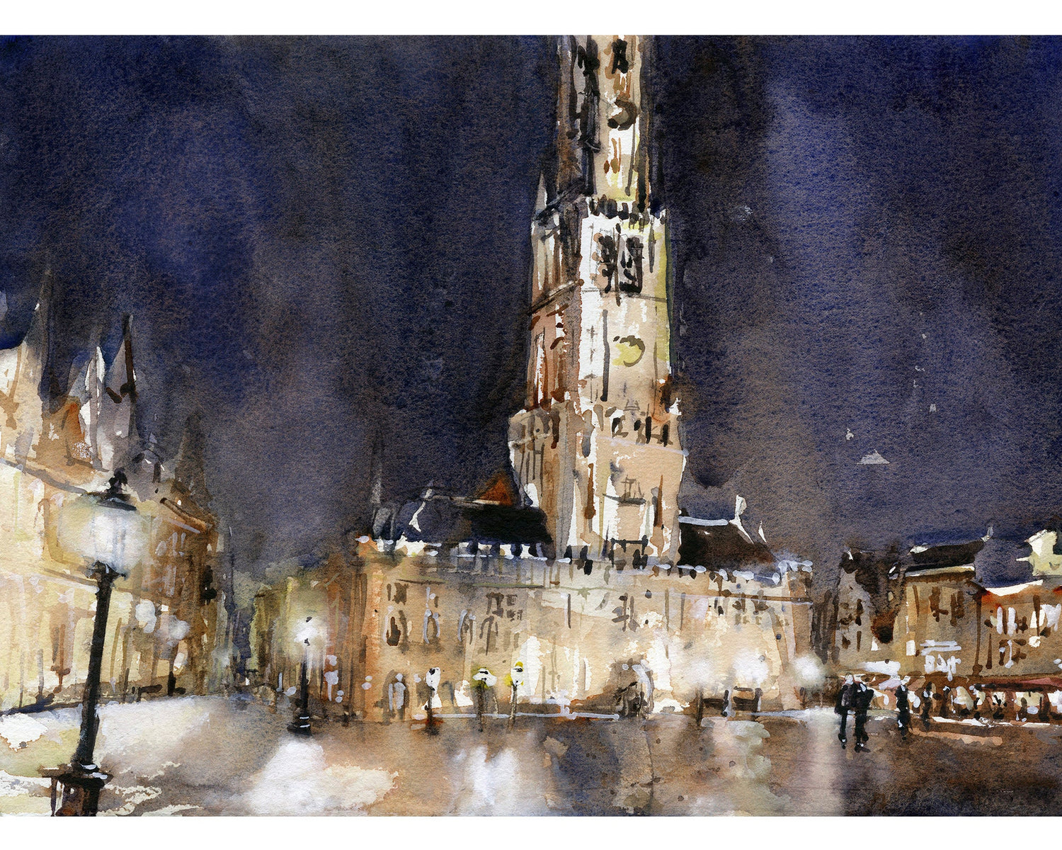 Bruges art. Medieval bell tower in the centre of Bruges, Belgium. Watercolor painting of Bruges Belgium belfry skyline artwork (print)