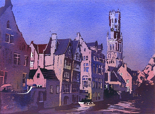 Bruges Belgium medieval bell tower in the centre of Bruges, Belgium. Watercolor painting of Bruges church art Europe Bruges home decor (print)