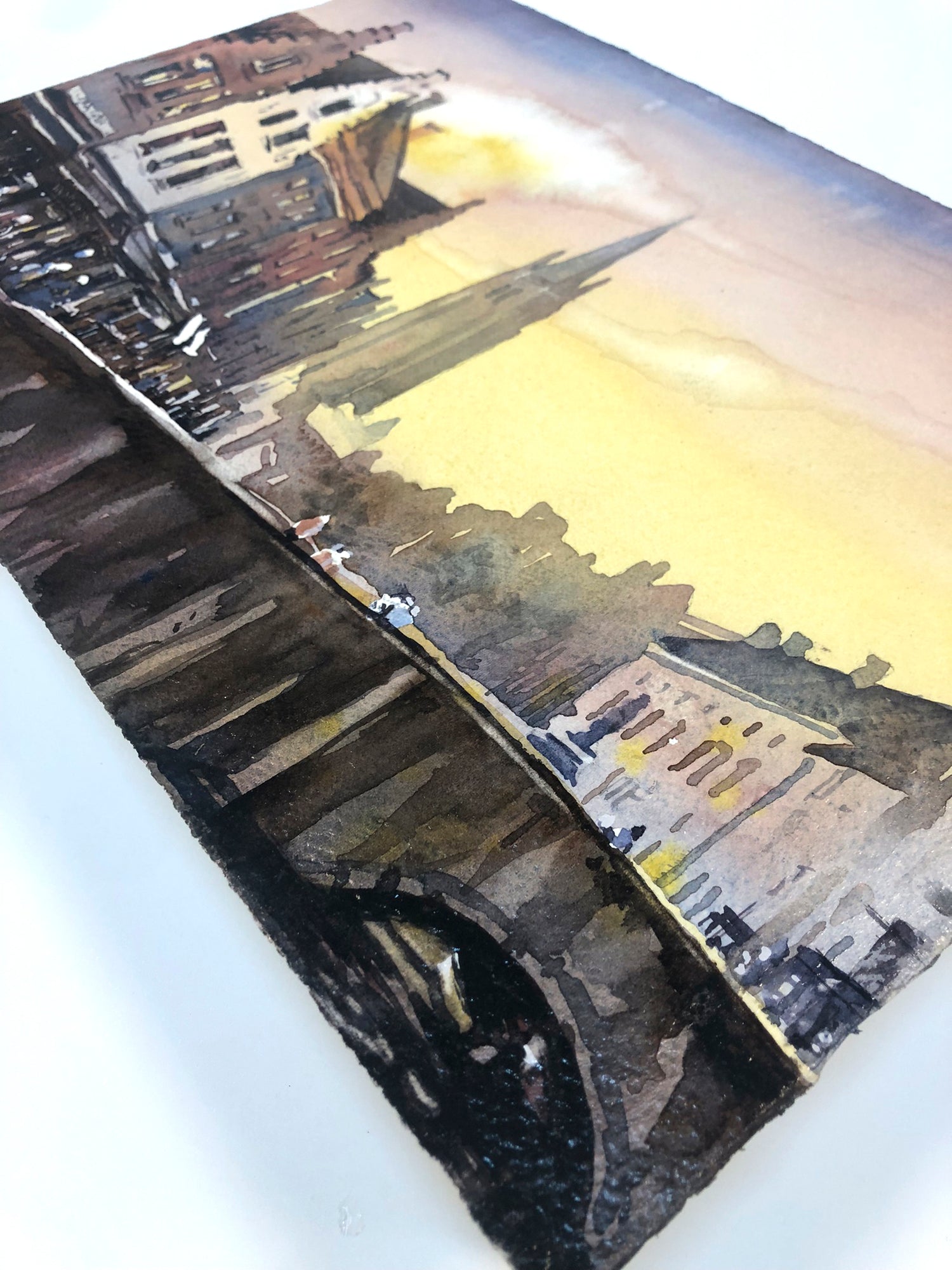 Bruges, Belgium sunset painting. Watercolor painting Belfry of Bruges rising over medieval builidngs of city. Bruges skyline (original)