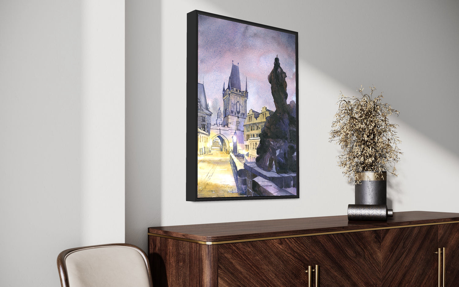 Watercolor painting of statues on Charles Bridge in medieval city of Prague- Czech Republic. Prague Charles Bridge watercolor art (print)