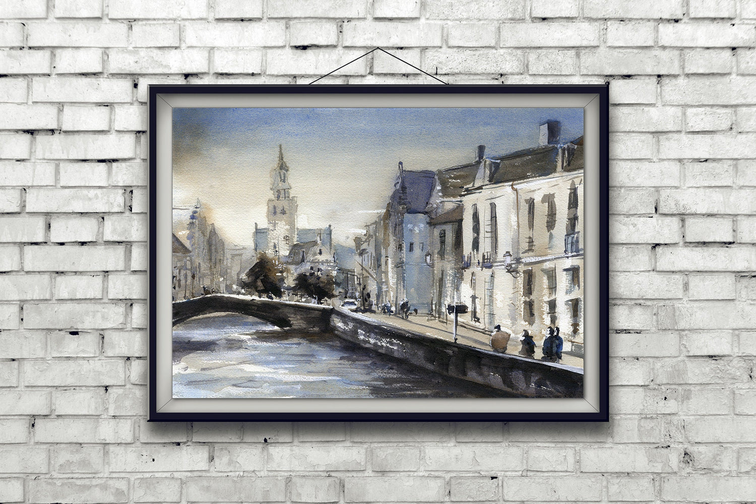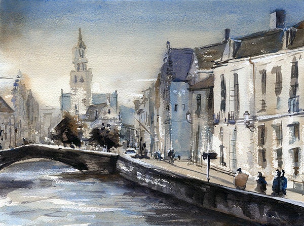 Church rising over medieval buildings of Bruges, Belgium at Jan Van Eyck Square. Watercolor painting of Bruges Belgium art watercolor (print)