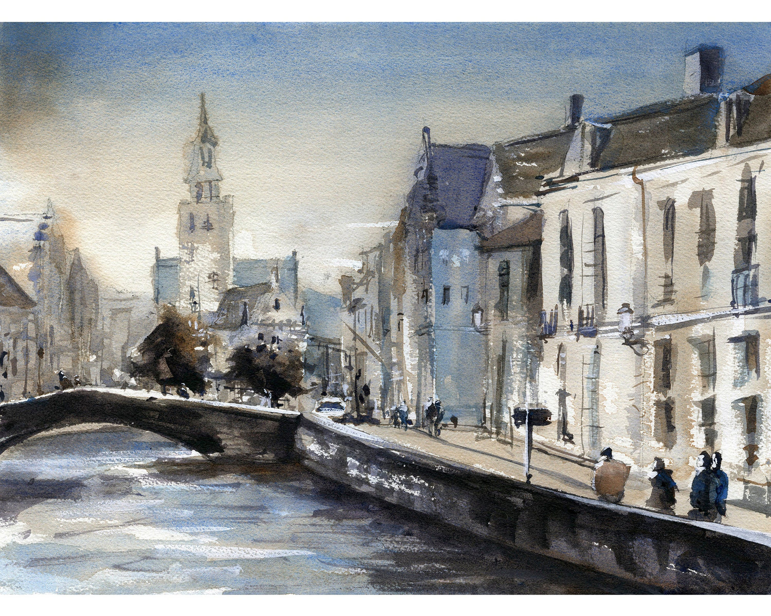 Church rising over medieval buildings of Bruges, Belgium at Jan Van Eyck Square. Watercolor painting of Bruges Belgium art watercolor print