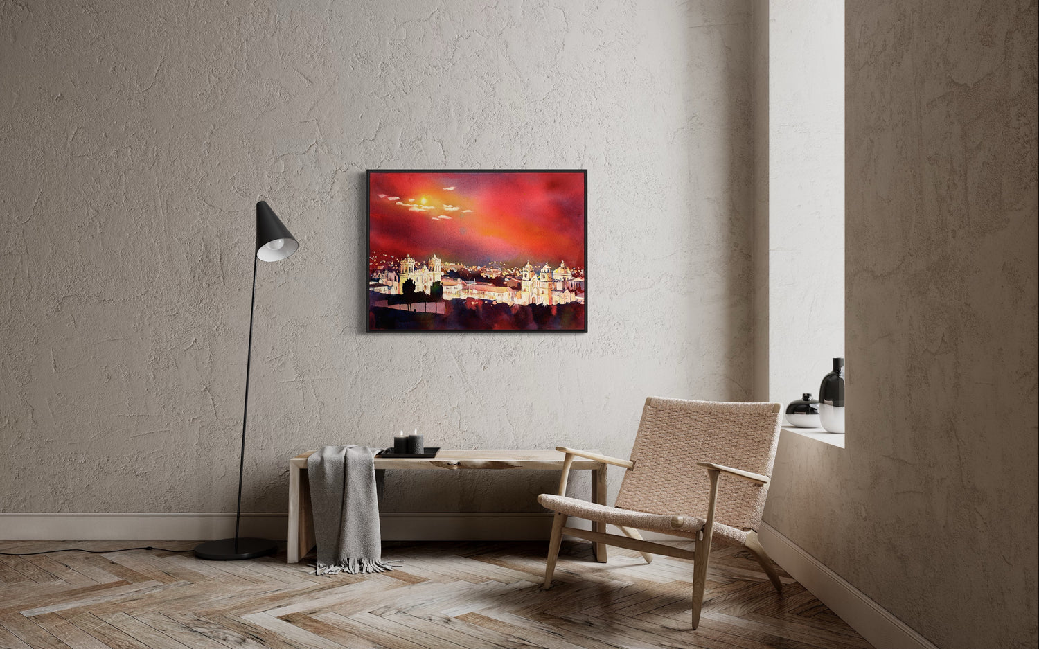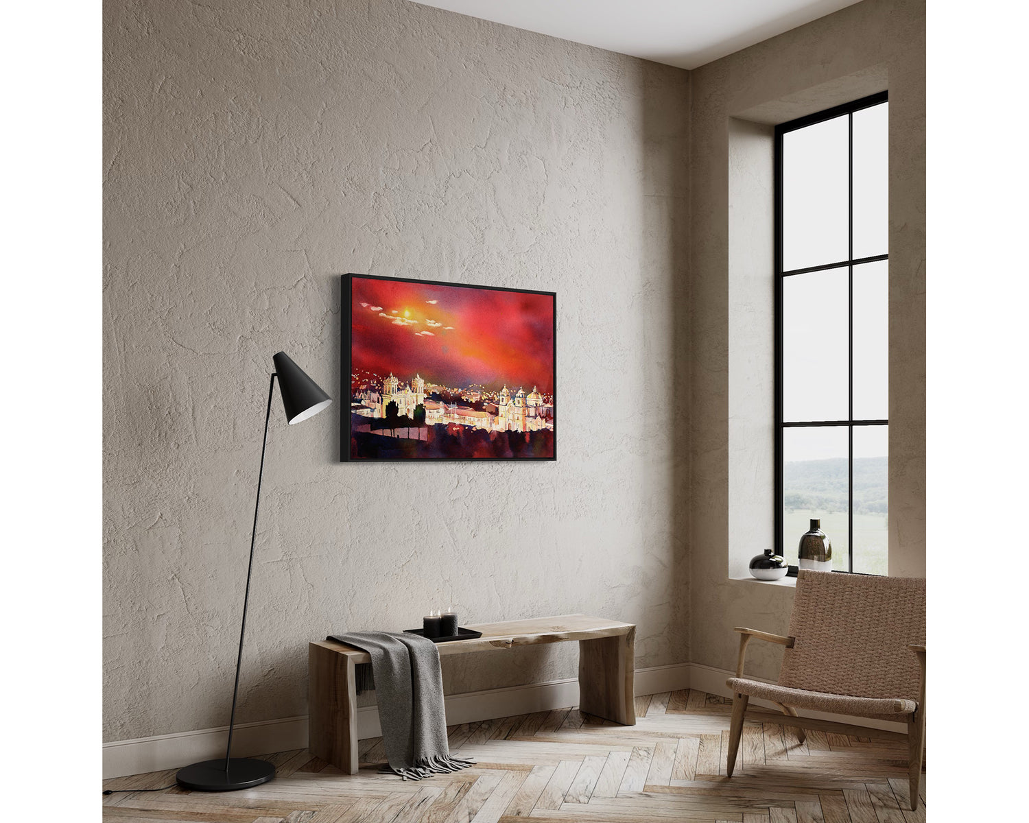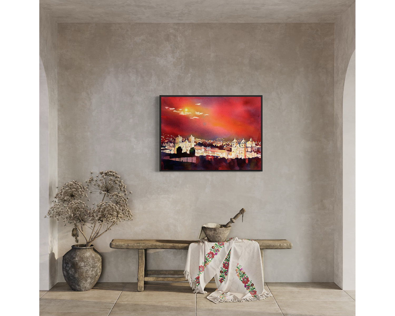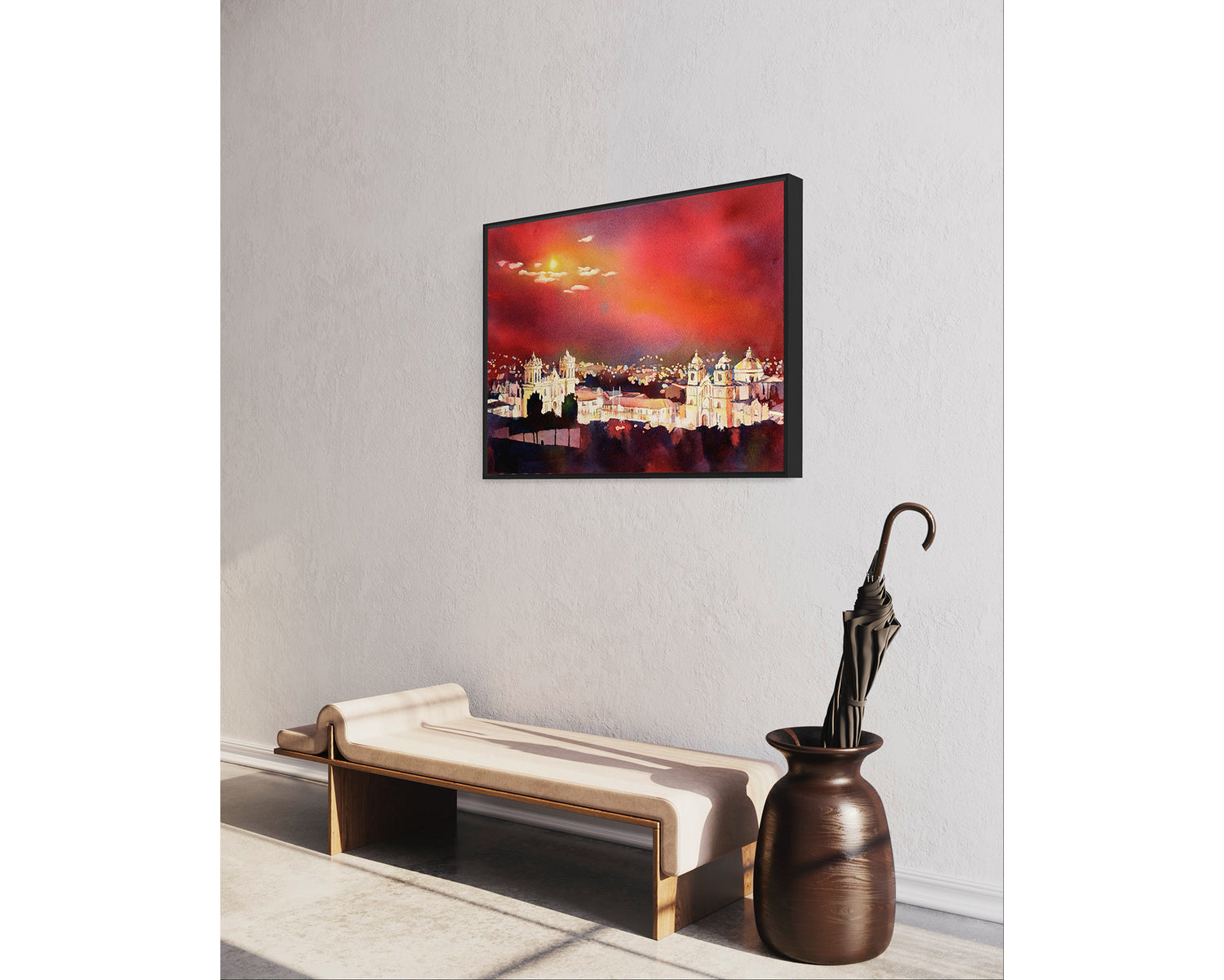 Fine art poured watercolor painting of colonial churches on the Plaza de Armas in the Incan city of Cusco at night- Sacred Valley, Peru. Original painting. Watercolor painting. Art print. Home decor red.