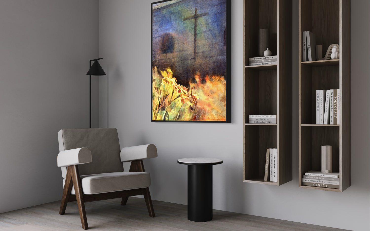 Watercolor painting of flowers and cross inside the Monastery of Santa Catalina in the city of Arequipa, Peru. Peru art Arequipa painting