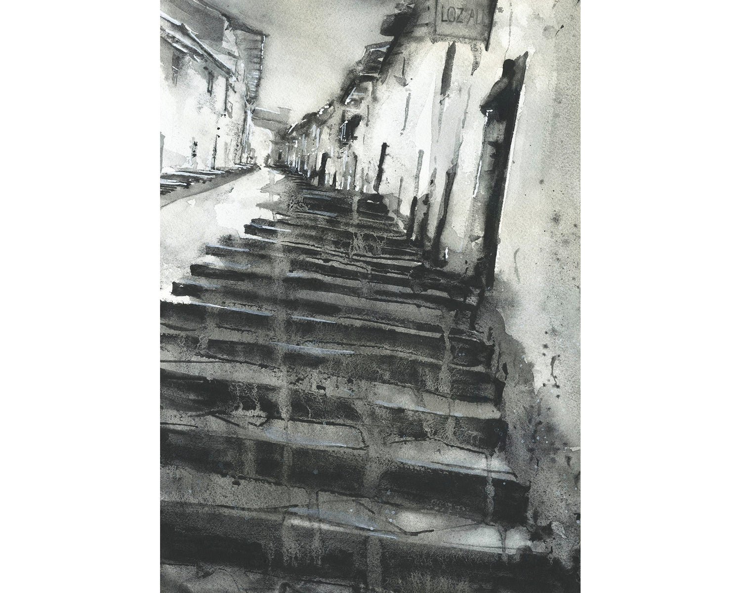 Cusco fine art watercolor painting- Peru. Street scene in Incan city of Cusco, Peru fine art watercolor painting B&W artwork Cusco street.