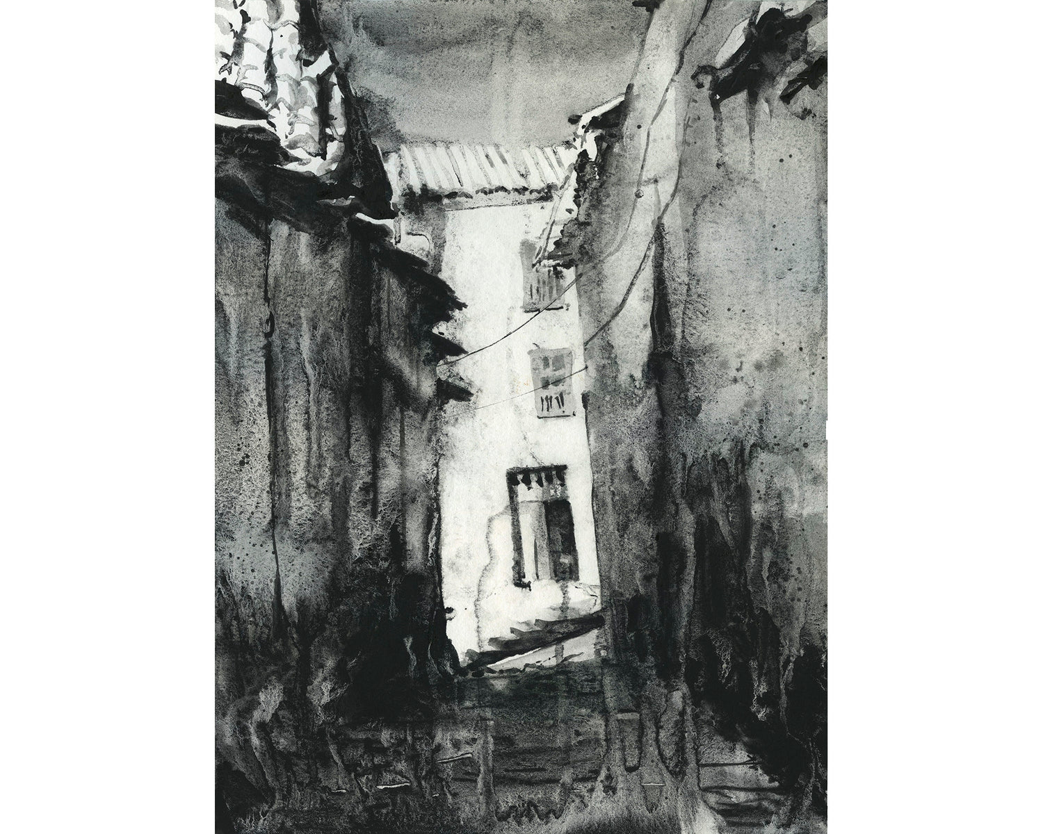 Doorway in the Incan city of Cusco, Peru. Monochromatic B&W watercolor painting Cusco household- Peru. Watercolor painting Cusco (print)
