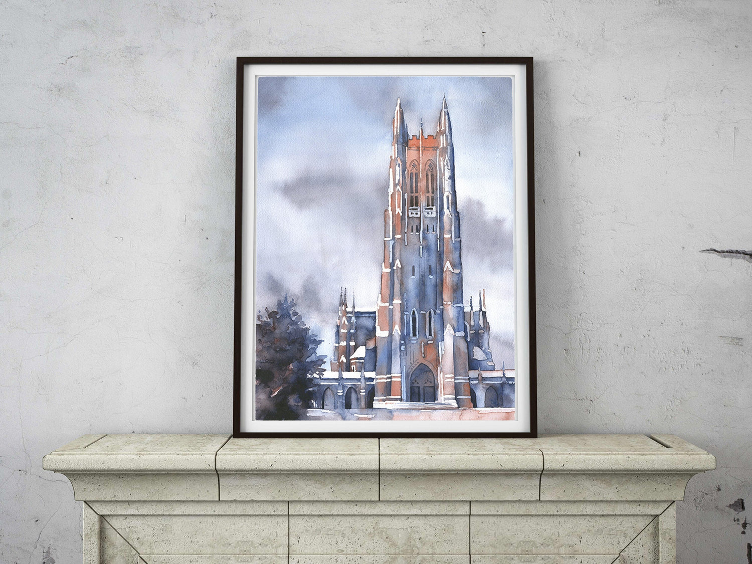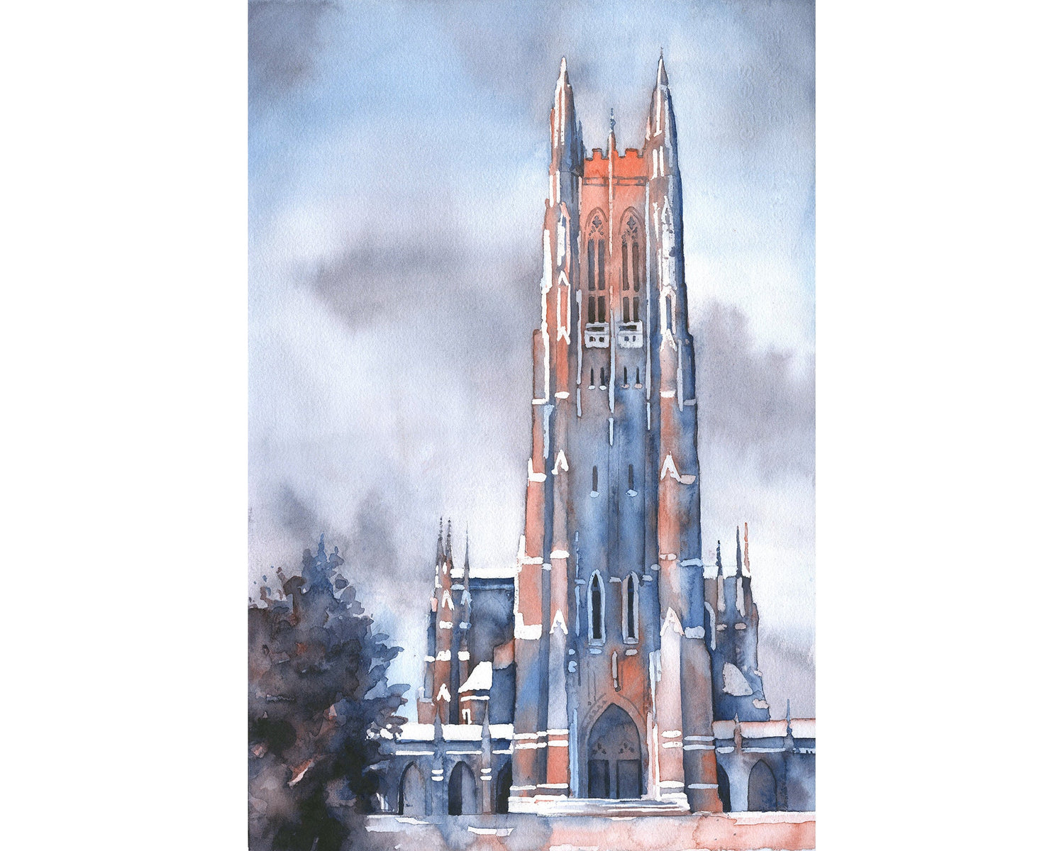 Duke Chapel on the Duke University campus- Durham, North Carolina (USA). Fine art watercolor Duke Chapel Blue Devils artwork print.