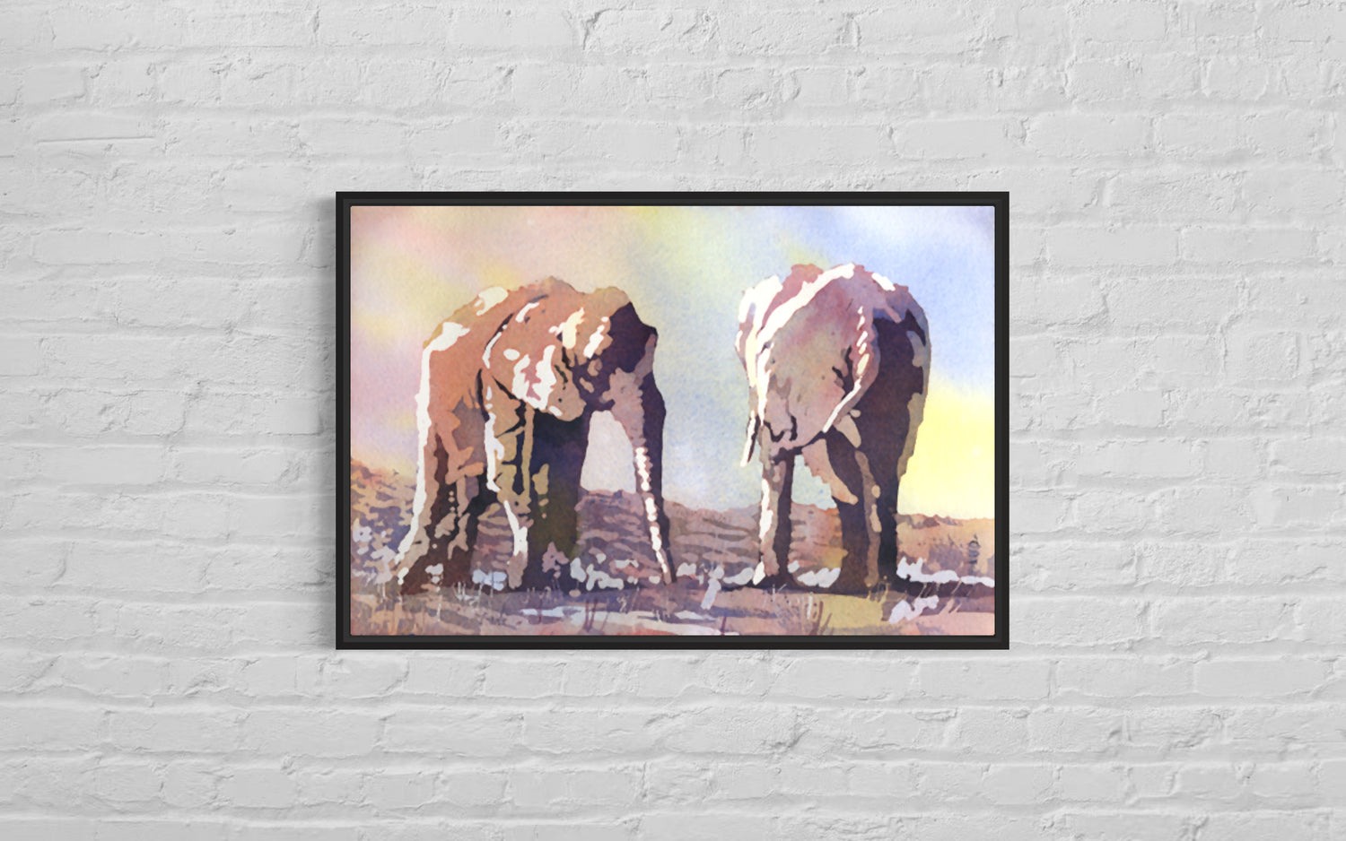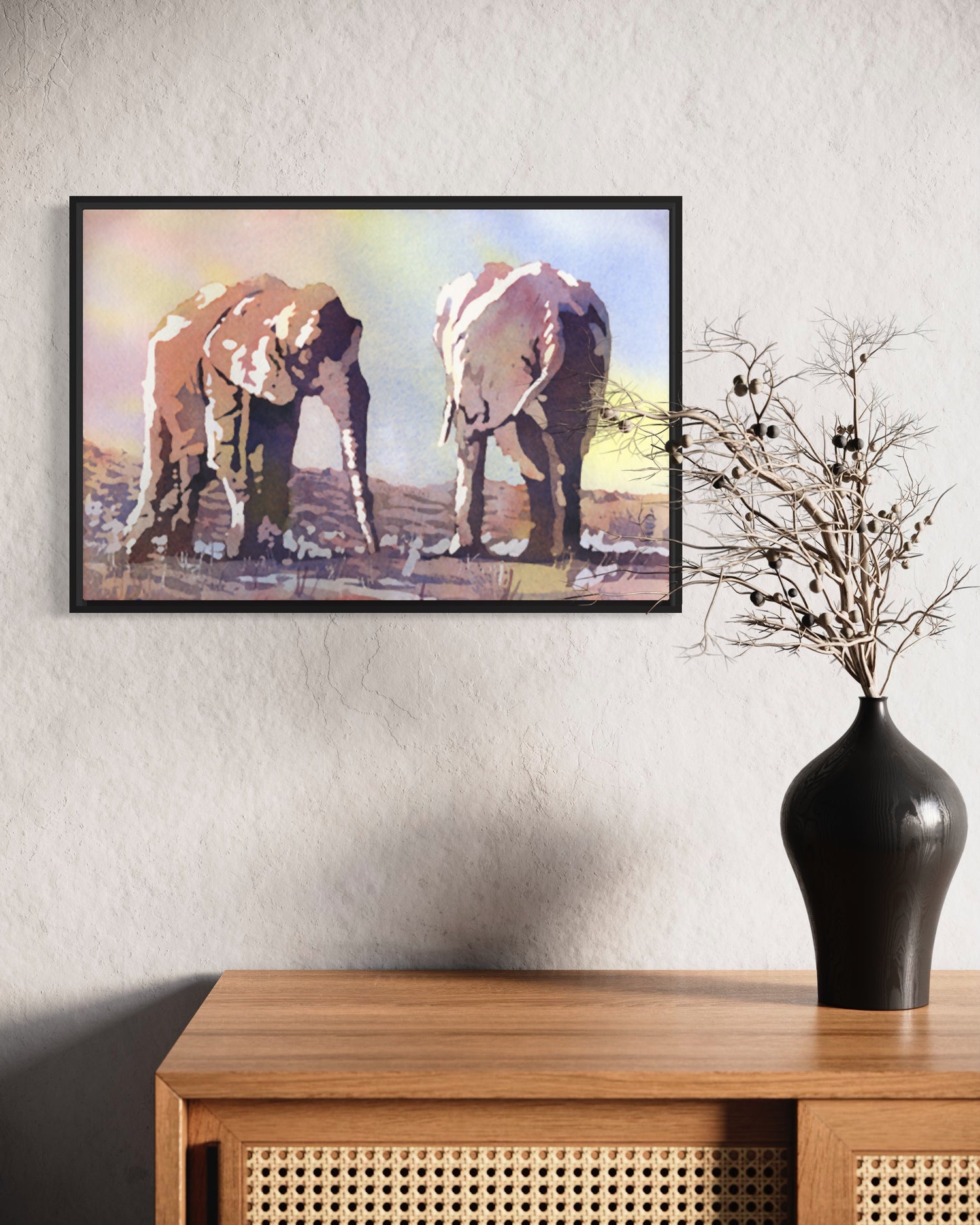 Fine art watercolor painting of elephants walking across savannah. Watercolor painting elephant art wall art watercolor print home decor.