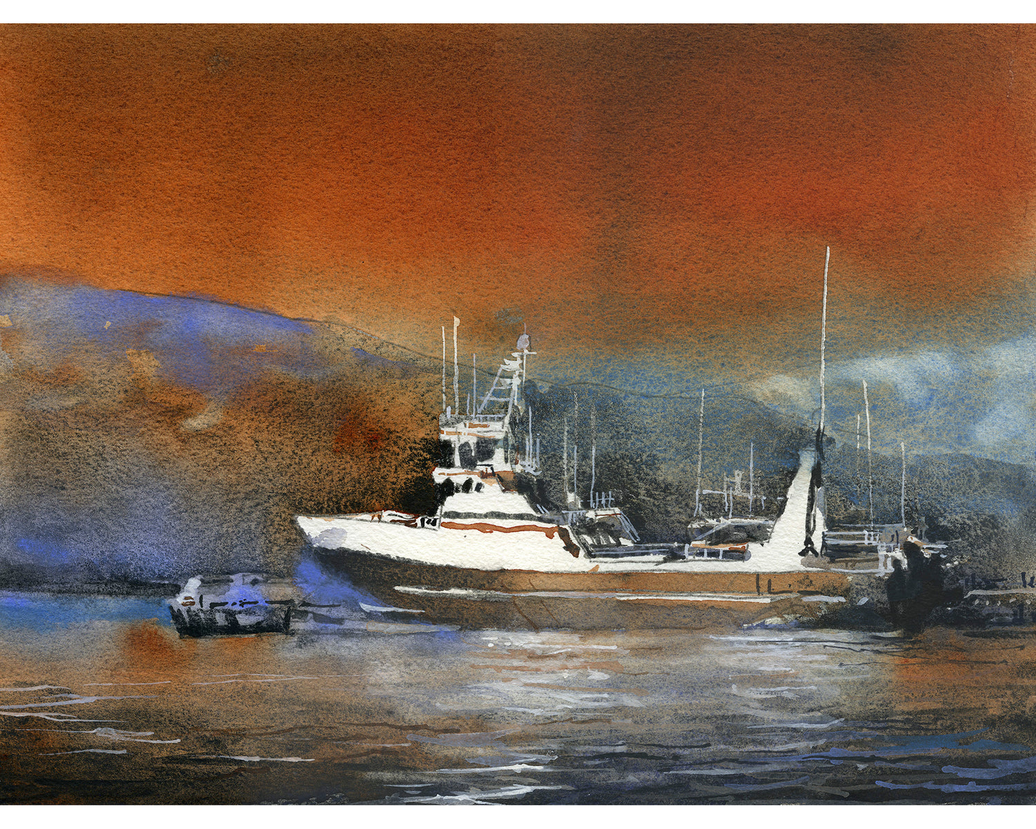 Fishing boat Iceland artwork. Icelandic fishing boat Dalvik Iceland at sunset watercolor painting water orange blue decor fine art (original)
