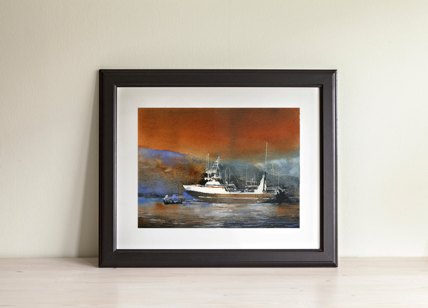 Fishing boat Iceland artwork. Icelandic fishing boat Dalvik Iceland at sunset watercolor painting water orange blue decor fine art (original).
