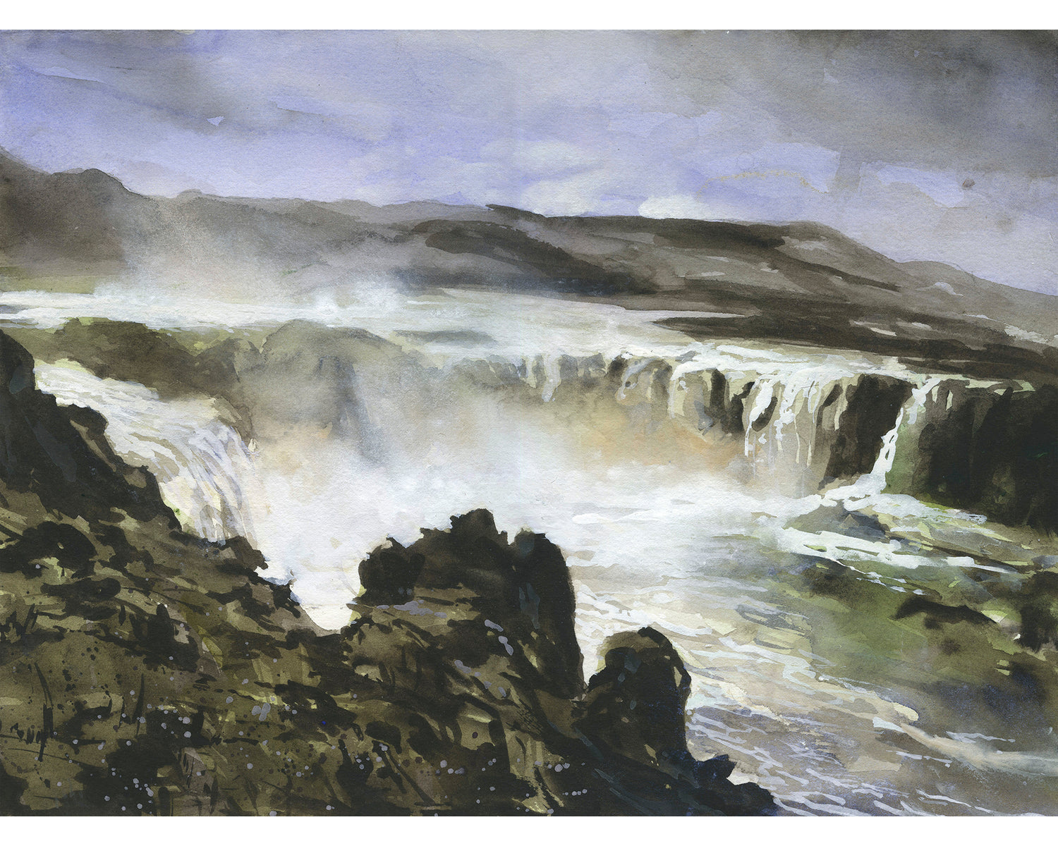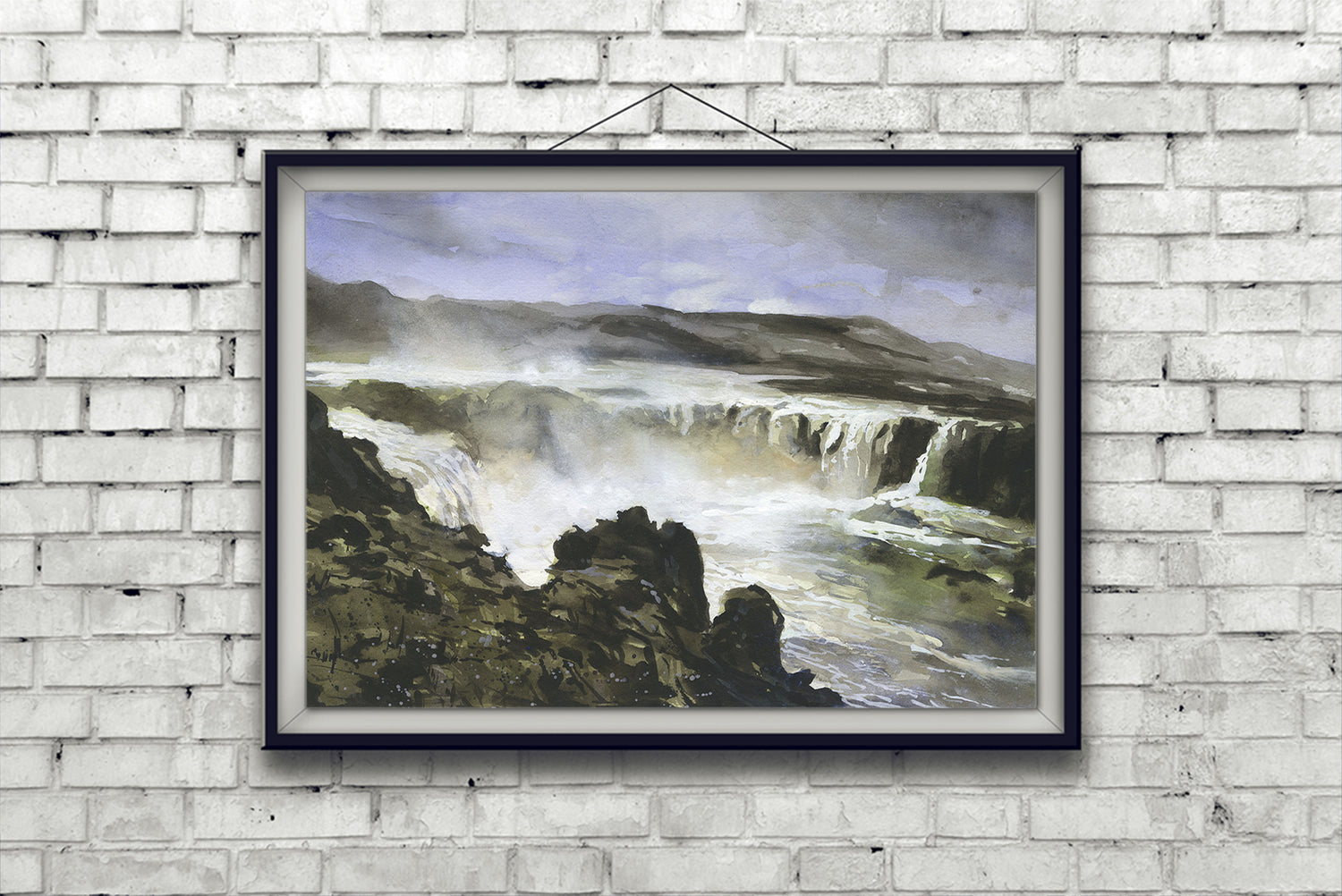 Icelandic waterfall watercolor painting. Godafoss waterfall Icelandic landscape watercolor painting fine art Icelandic home decor (original painting)