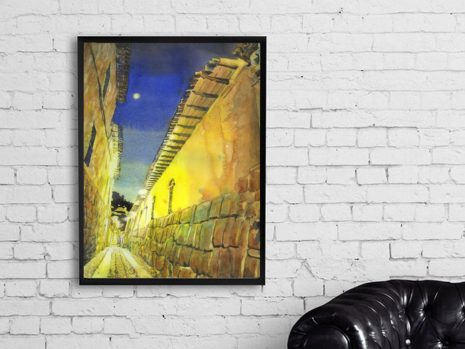 Incan stonework in the Callejon de Loreto at night in the city of Cusco, Peru. Cusco painting fine art yellow blue watercolor painting Peru (print)
