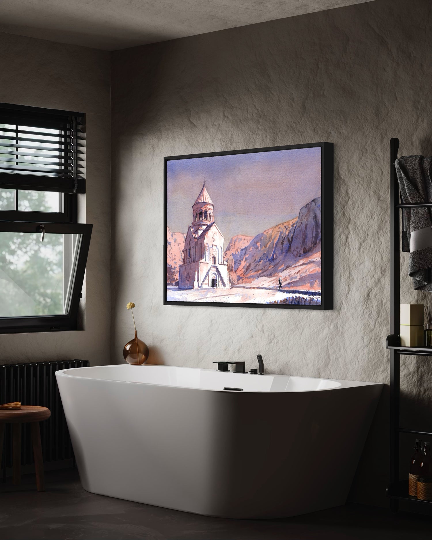 Khor Noravank monastery in Caucasus nation of Armenia colorful watercolor religious artwork.