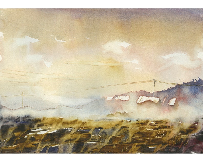 Mist covered landscape painting with buildings. Landscape watercolor painting fine art land colorful watercolor artwork art sunset (print)
