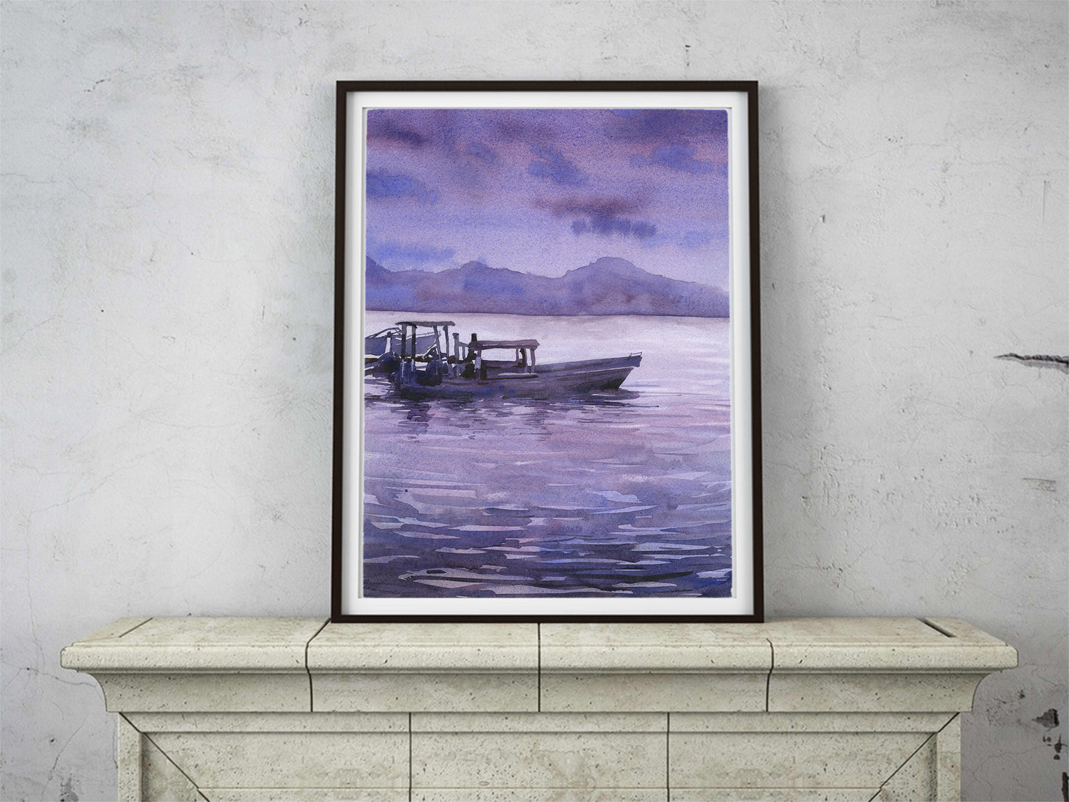 Watercolor landscape painting sunset Lake Atitlan Guatemala trendy wall art trave essentials lake boat nautical decor (print).