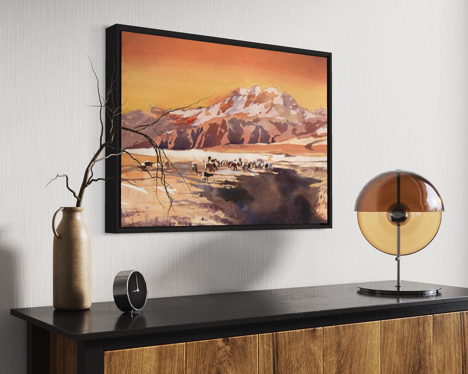 Watercolor landscape Sacred Valley llama grazing mountains South America Peru home decor travel essentials trendy wall art.