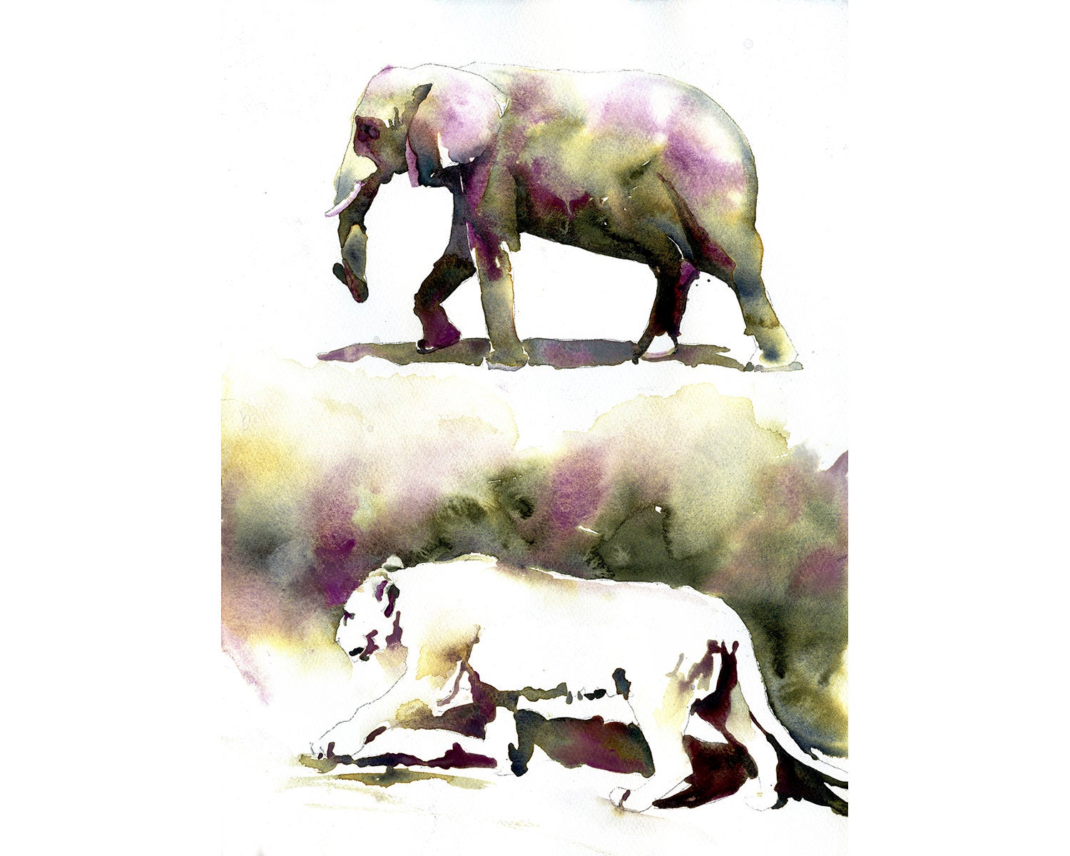 Watercolor painting of elephant and mountain lion. Animals at zoo, lion art, mountain lion painting, elephant watercolor painting colorful