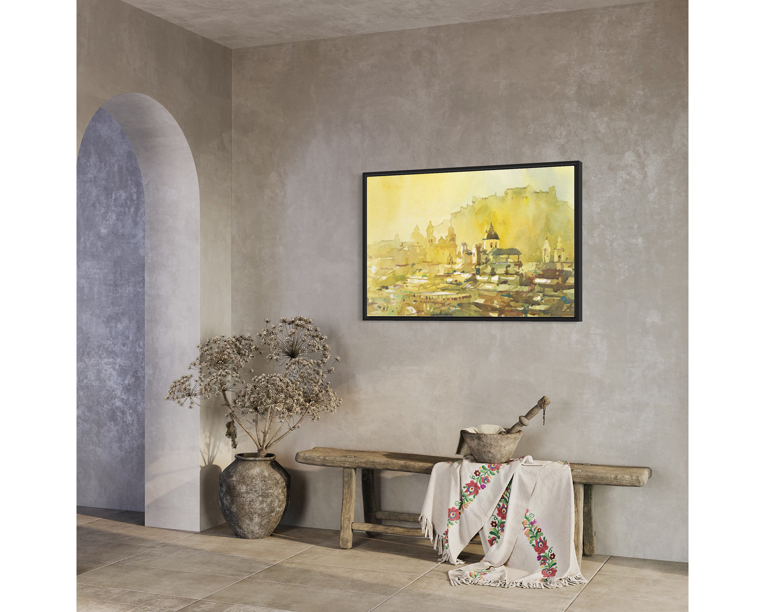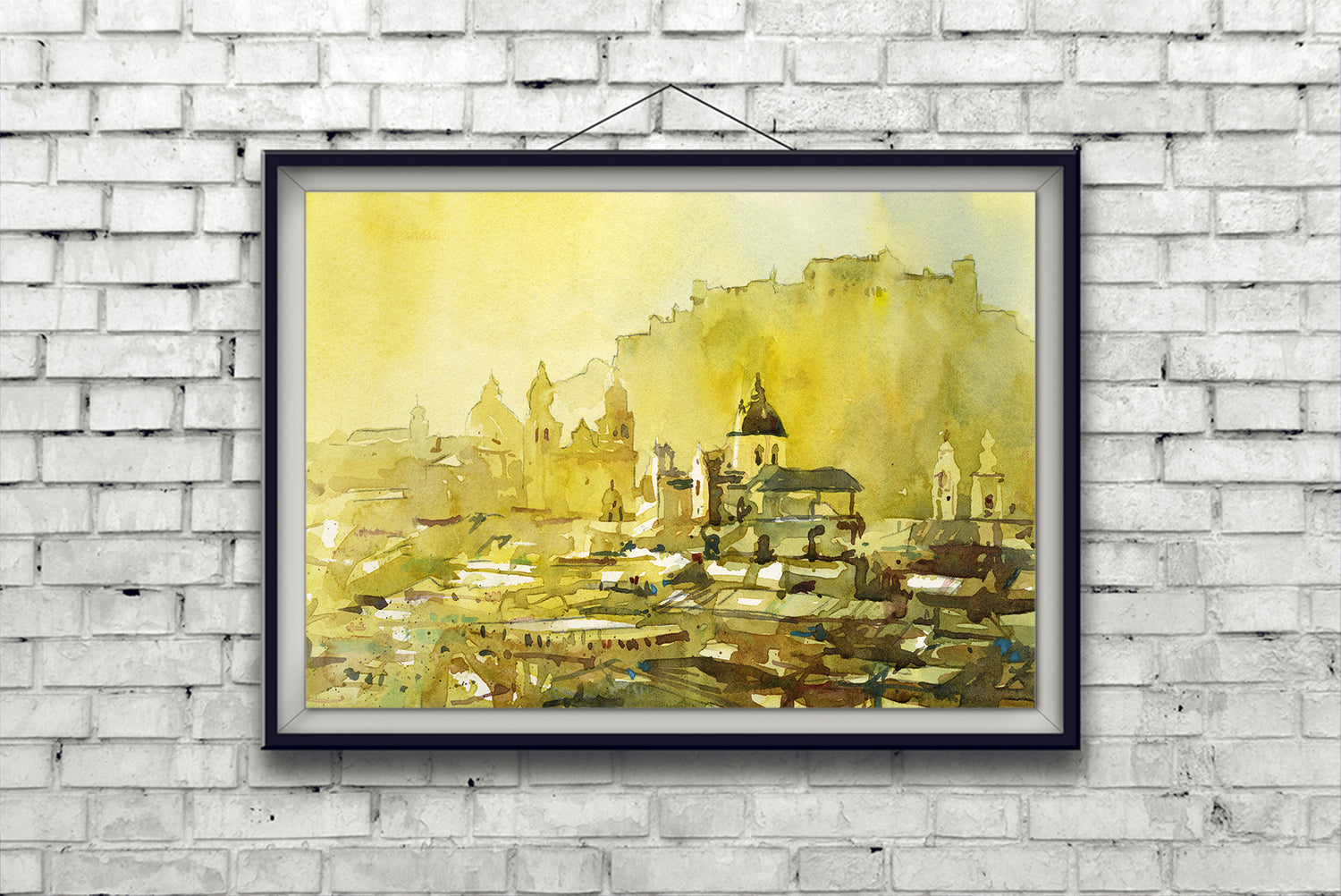 Salzburg Austria sunset landscape watercolor painting, trendy wall art Austrian architecture art for house
