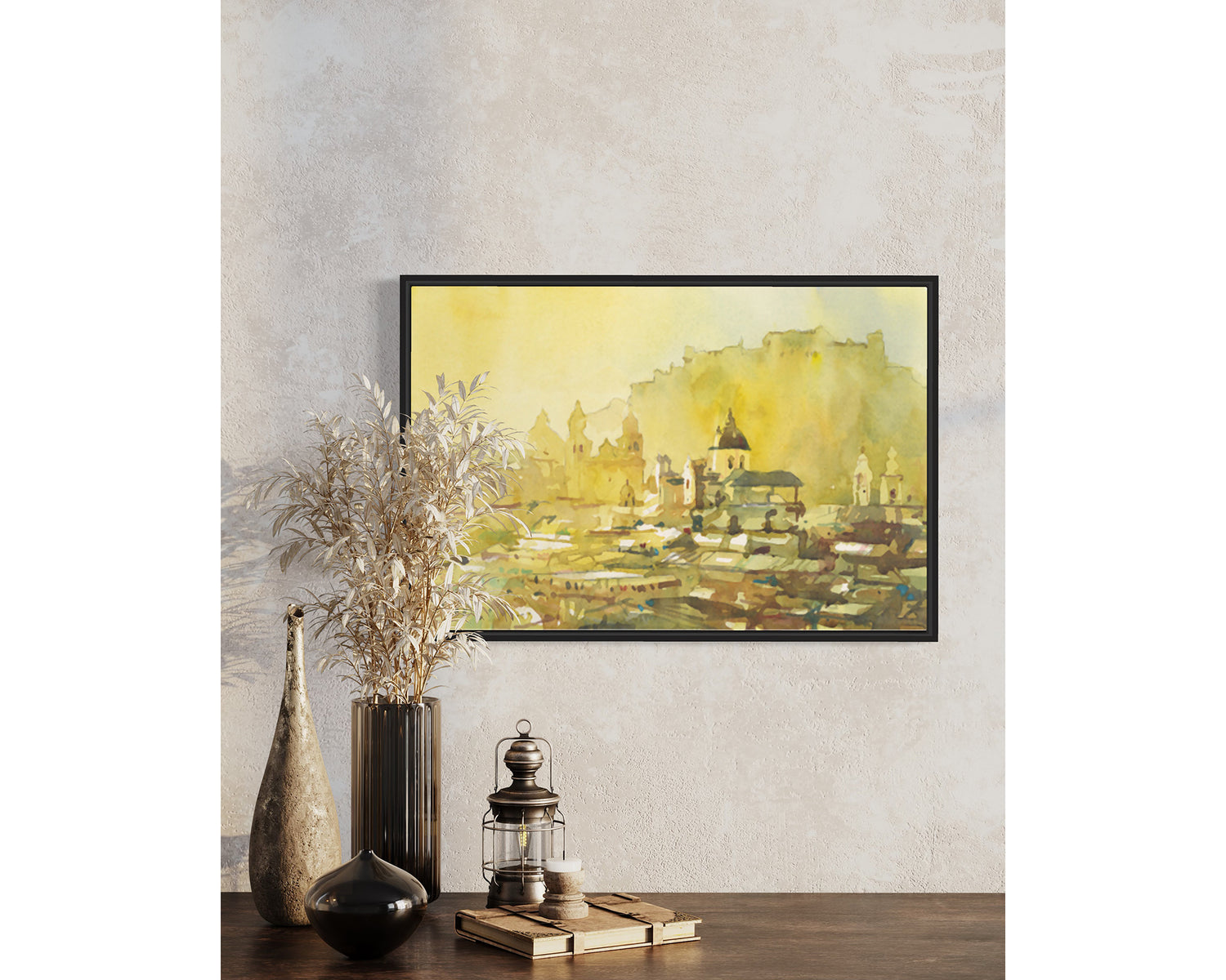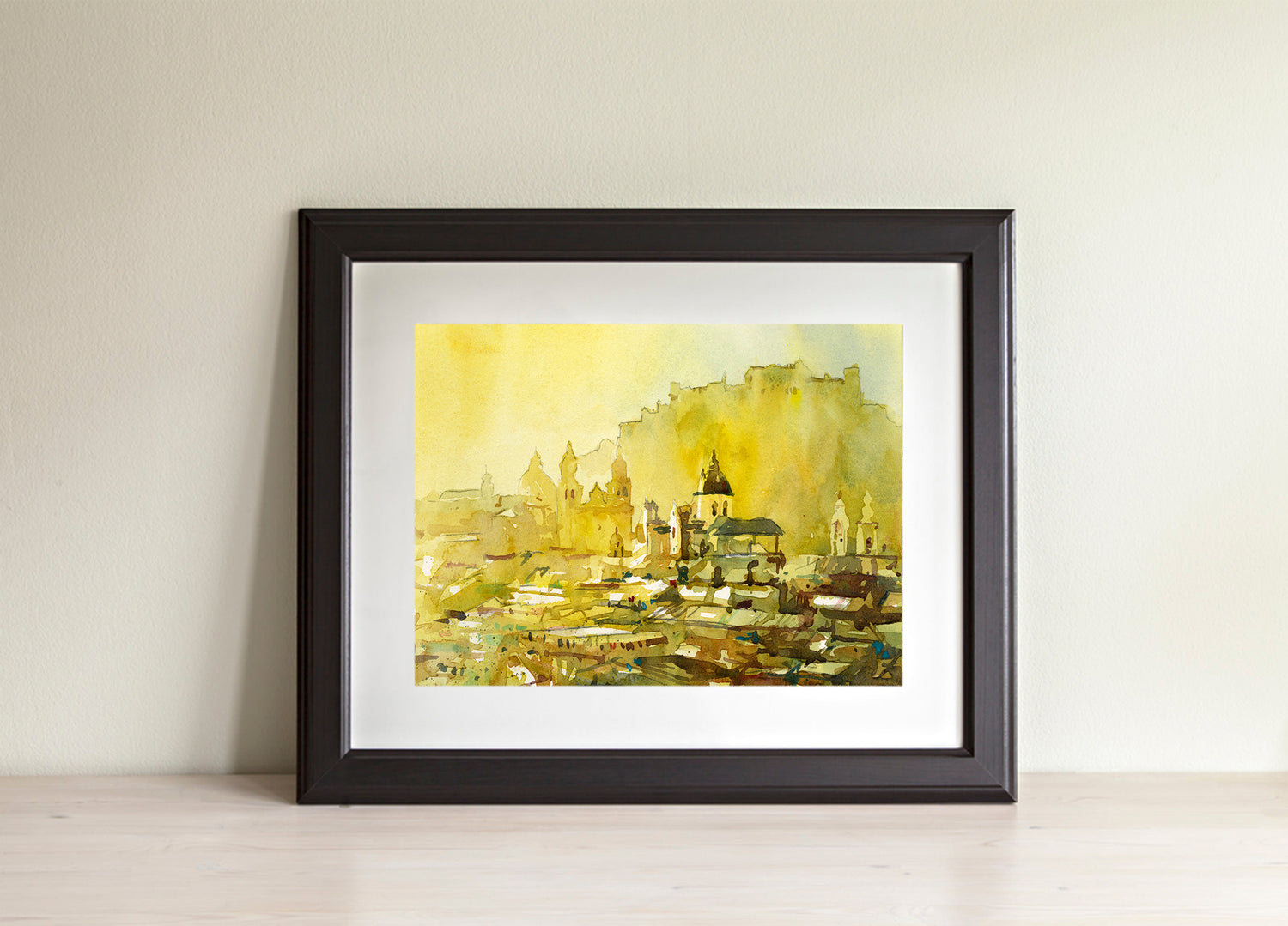 Watercolor painting Salzburg Austria skyline, trendy wall art Austrian architecture art for house (print)